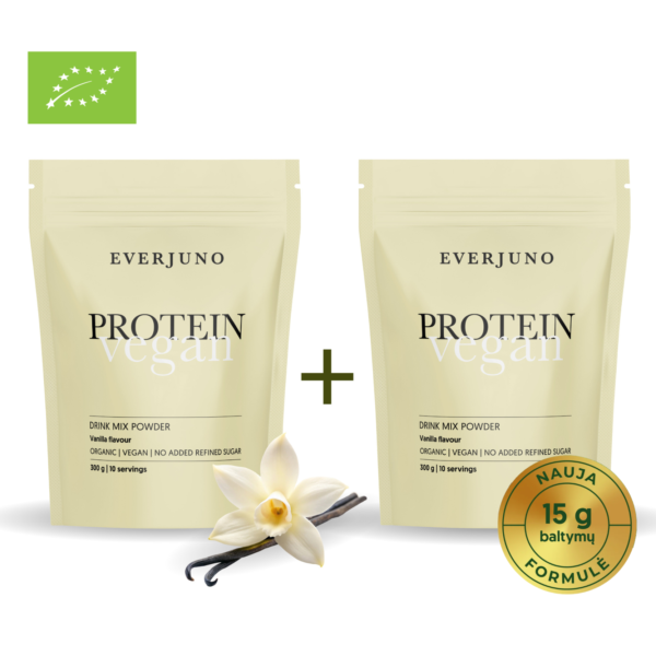 - Vegan Protein - natūralios burbono vanilės skonio augalinių baltymų kokteilis.