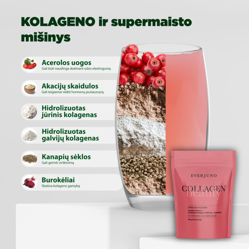 Everjuno hidrolizuotas kolagenas (10 000 mg) – tai I ir III tipo hidrolizuoto kolageno mišinys, papildytas natūraliais supermaisto ingredientais, padedančiais palaikyti normalią odos, plaukų, nagų ir kaulų būklę. Kiekvienoje porcijoje – 10 000 mg aukštos kokybės kolageno iš galvijų ir jūrinių šaltinių, praturtinto vitaminu C, cinku, kanapių baltymais, burokėlių ir acerolos ekstraktais.