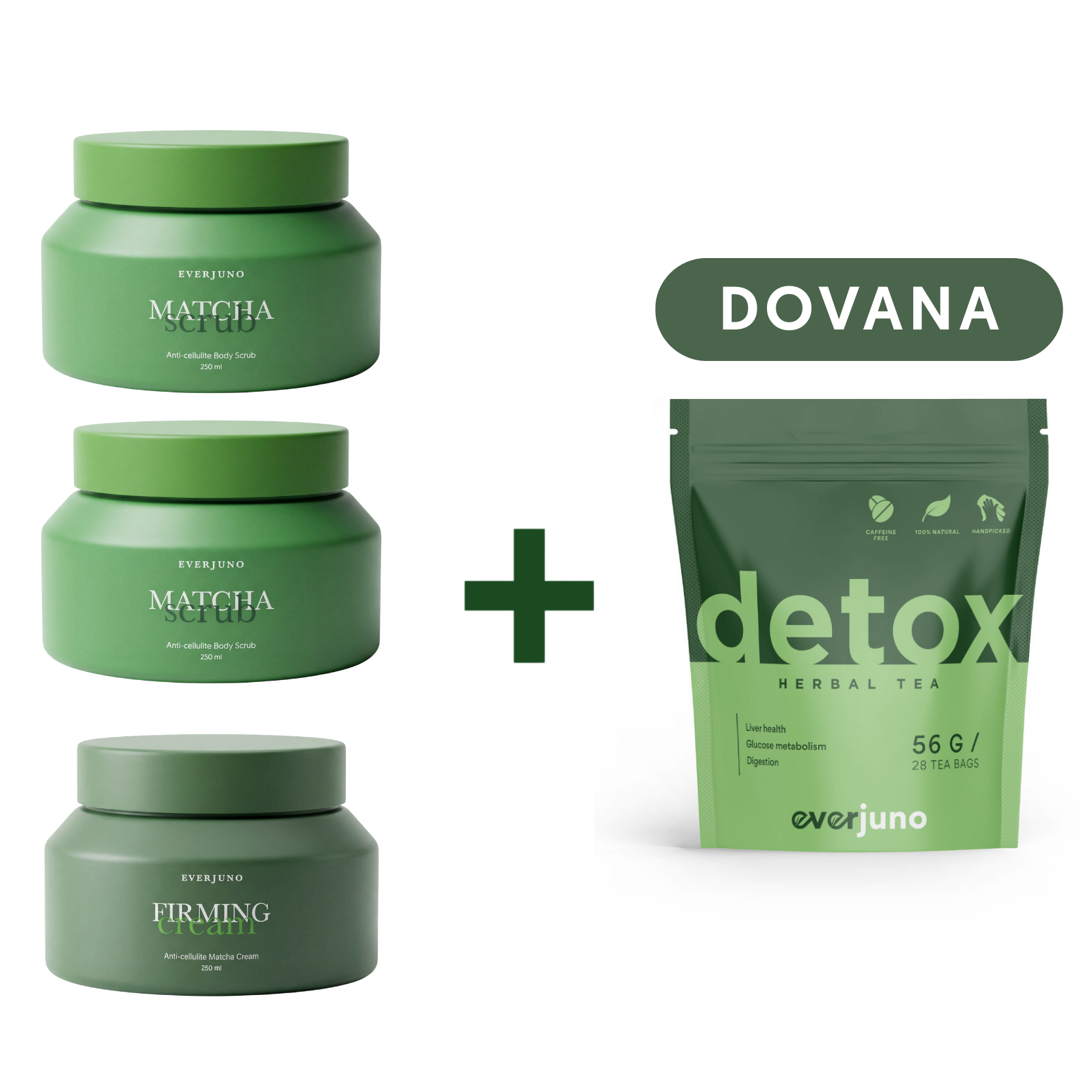 2x Šveitikliai ir kūno kremas su dumbliais ir matcha + Detox Tea DOVANA