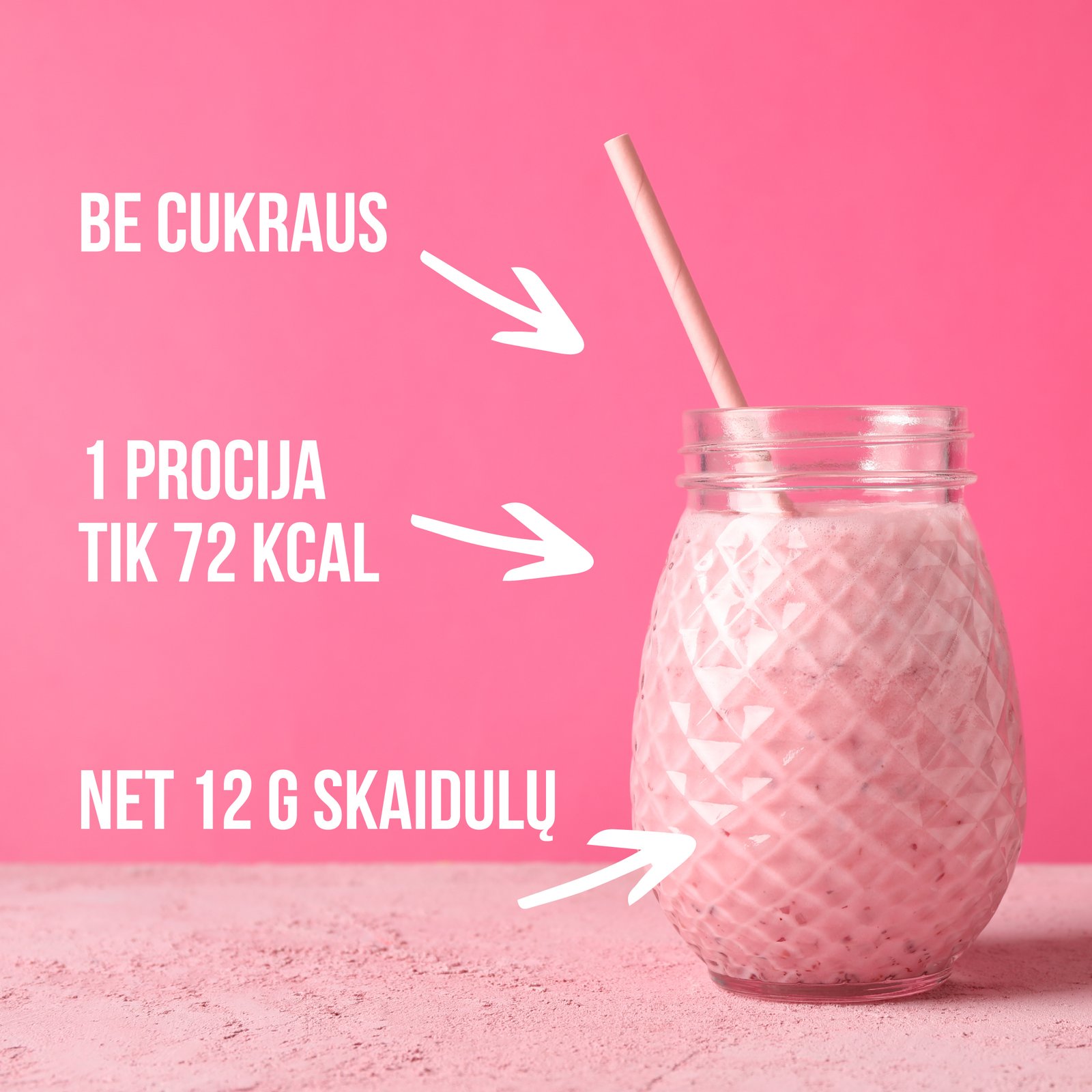 Sudedamosios dalys: Prebiotinių akacijų skaidulų milteliai*, šaltyje džiovinti braškių milteliai* (16%), žirnių baltymų milteliai*, kanapių sėklų baltymų milteliai*, šaltyje džiovinti aviečių milteliai*, šaltyje džiovinti burokėlių milteliai*, konjako gliukomanano šaknies milteliai*, jūros dumblių milteliai*, stevijos lapų ekstrakto milteliai*, saldiklis eritritolis. Sudėtyje gali būti glitimo turinčių javų, sezamo, garstyčių, pieno, žemės riešutų ir kitų riešutų pėdsakų. Sudėtyje yra poliolių (eritritolio), vartojant dideliais kiekiais gali sukelti viduriavimą. *Ekologiški ingredientai